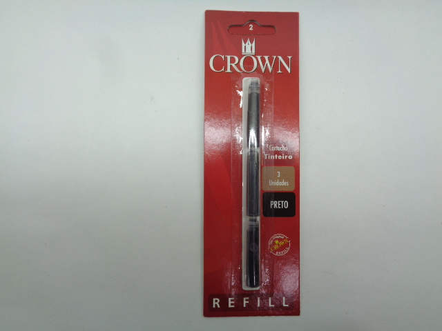 Embalagem com 3 Cartuchos de tinta Crown c/3, cor preto permanente, medida universal cabe em diversos modelos de canetas.